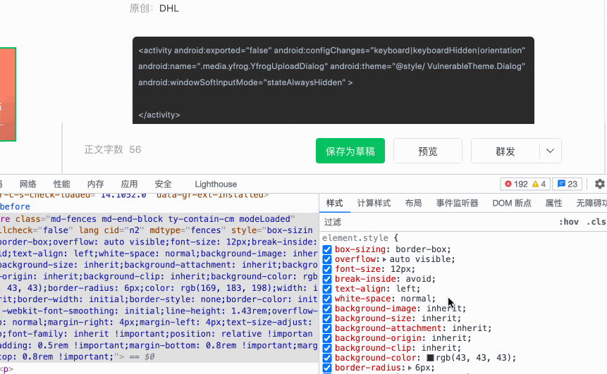 当我们拷贝文章的时候,也会拷贝当前使用的 css 样式,因此我们需要分析拷贝后生成的 css 样式,所以我们需要打开 WX 编辑器,按 F12 或者 点击鼠标右键 ->「检查元素」 打开浏览器调试台,分析一下生成后的 css 样式。