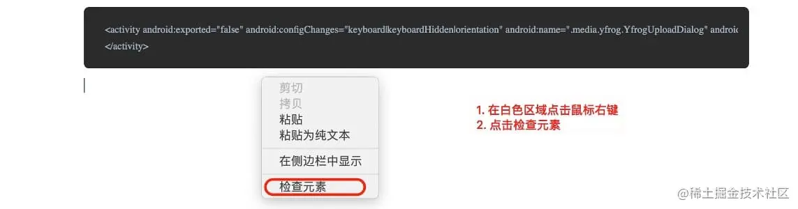然后在空白处点击鼠标右键,将会出现 **「检查元素」**的选项, 下图所示。