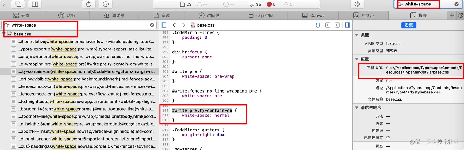 我们回到 Typora 调试台,搜索这个样式,看看是由那个 css 文件控制的,如下图示。