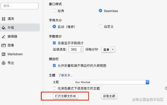 打开 Typora -> 点击偏好设置 -> 点击外观 -> 打开主题文件夹