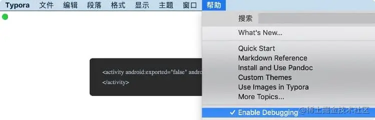 有了以上基础 css 知识之后,我们还需要找到 Typora 控制代码块的 css 样式,打开 Typora debug 模式: 顶部菜单帮助 -> Enable Debugging。