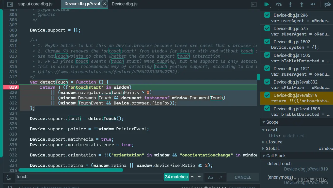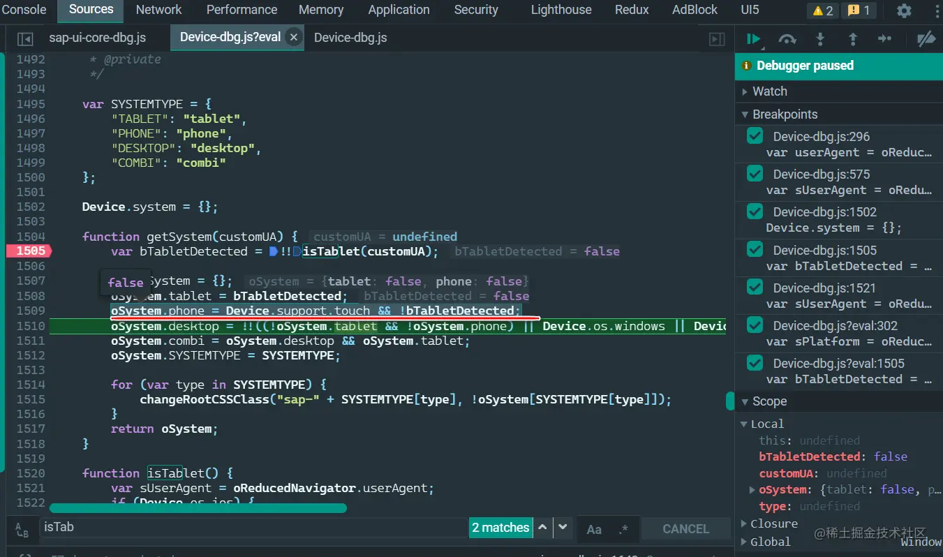 从下图代码,我们终于找到了 SAP UI5 判定当前 device 是 phone 的逻辑:如果设备支持 touch 操作并且不是 tablet,那么一定是 phone.