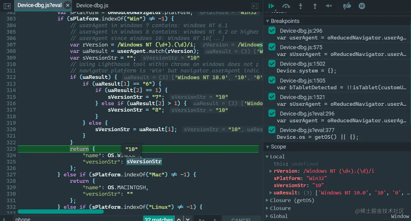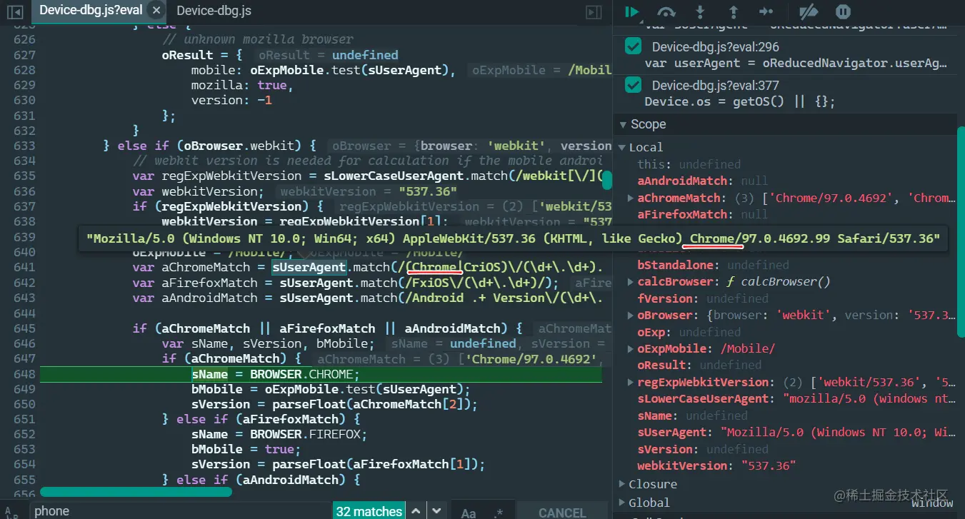 最后仍然通过正则表达式结合 userAgent,检测出我在 Windows10 操作系统上使用的浏览器类型为 Chrome: