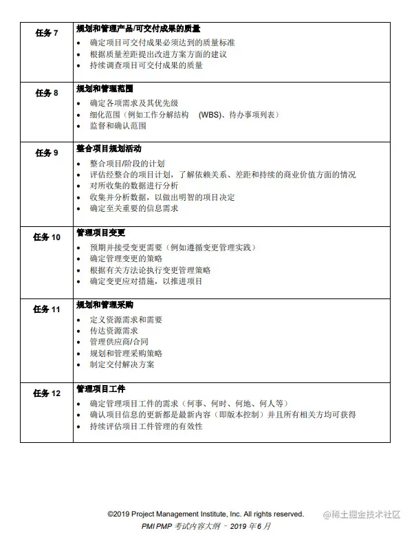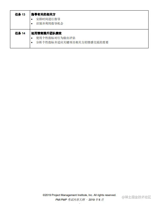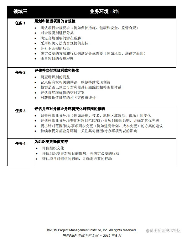 最后,本更新后的《PMP 考试内容大纲》与《项目管理知识体系指南》(下称《PMBOK® 指南》)(第 6 版)之间存在显著区别。虽然二者之间存在一些共同之处,但非常重要的需指出的是,参与上述研究的 志愿者工作组不受《PMBOK®指南》约束。