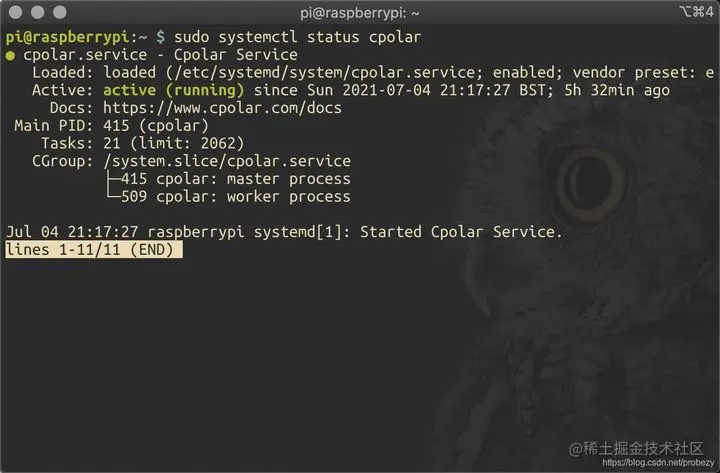 如下图所示,只要显示为“active”,就说明cpolar启动状态设置成功。