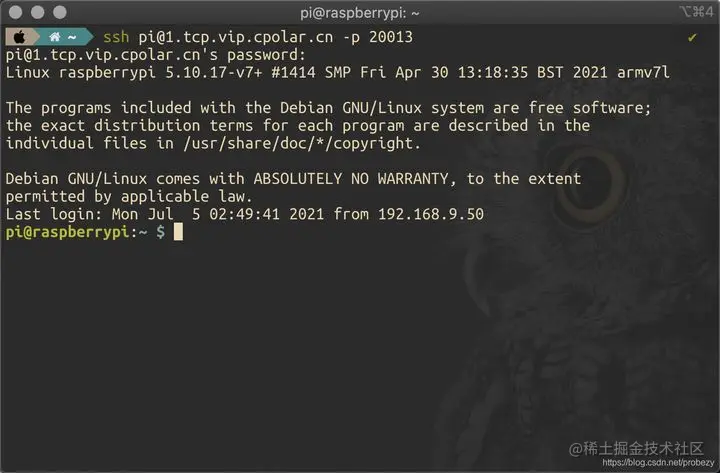 由于cpolar在激活后就生成了SSH隧道,因此我们只要把本地树莓派的端口与公共互联网的隧道端口对应起来,就能在公共互联网上找到我们的树莓派。即输入命令