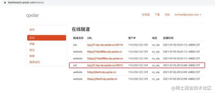 一般情况下,cpolar会建立两个样例数据隧道,一个为Website隧道(端口为http 8080),另一个为SSH隧道(端口为TCP 22),如下图所示: