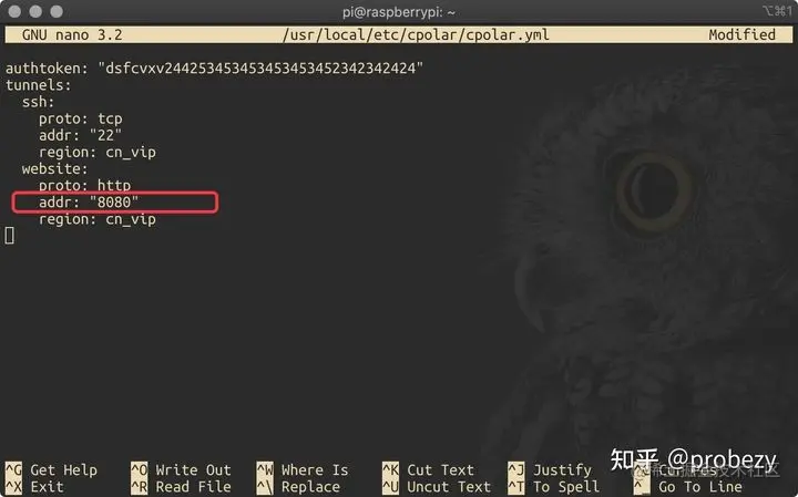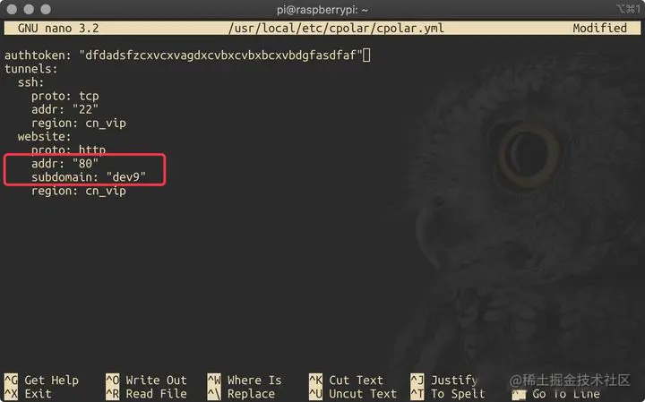输入命令“nano /usr/local/etc/cpolar/cpolar.yml”后,显示如下图:
