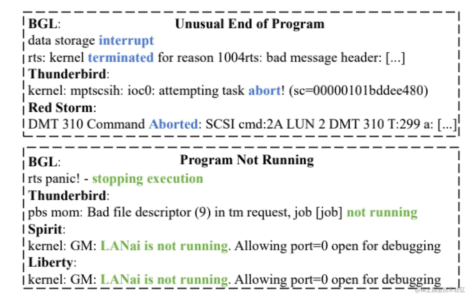 如下图所示,不同的系统间存在着相同的异常问题,因此有些低日志资源的系统也可以分享一般性日志语义知识进行异常检测。例如图中的BGL、Thunderbird、Spirit、Liberty系统都会发生“Program Not Running”这个异常问题。