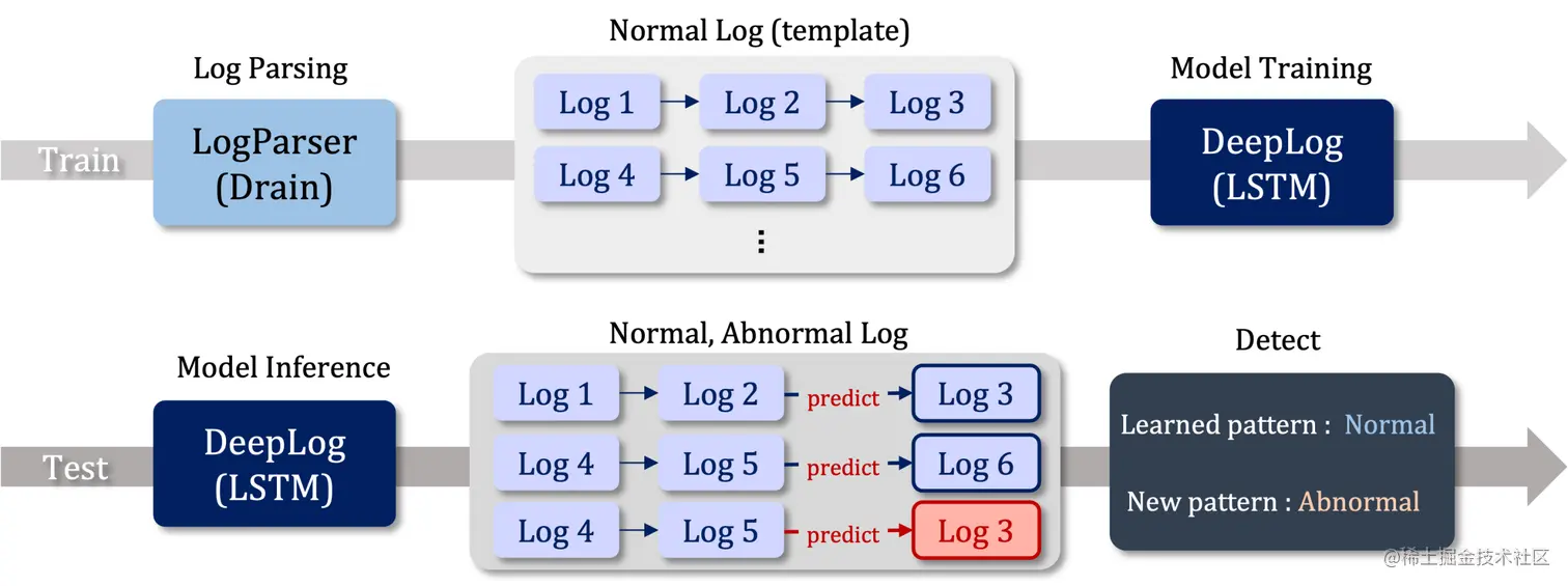 如下图所示,模型分为训练和测试两阶段,在训练阶段,原始日志经过日志解析后得到模板,随后经过LSTM网络学习表征,预测下一条日志的模板。在测试阶段,测试数据输入模型后得到预测的模板结果,如果预测的模版不在Top k个模版内,那么该条日志就被判为是异常的。