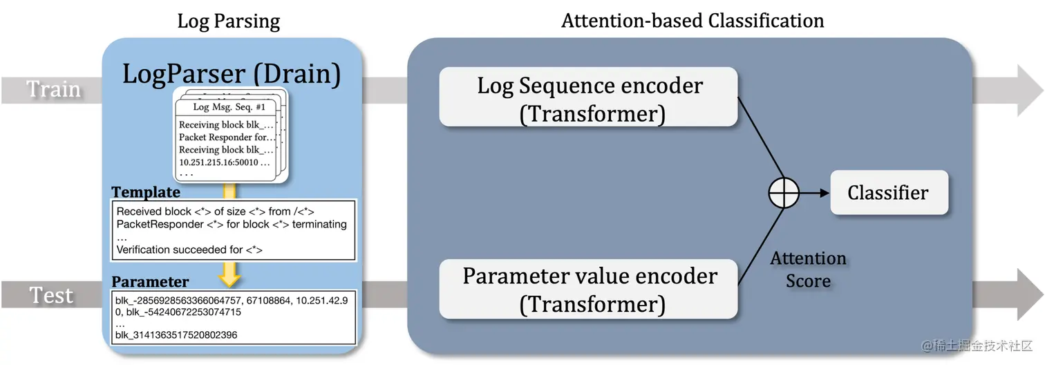 模型也是基于有监督学习,采用了基于Transformer的架构。日志解析器依旧采用Drain, 在模式解析中,模板往往不会保留日志原始的数值信息,但是该模型将丢失的数值信息一并送入模型中编码,最大程度的保存了原始日志的信息,这也就是该工作的创新点所在。