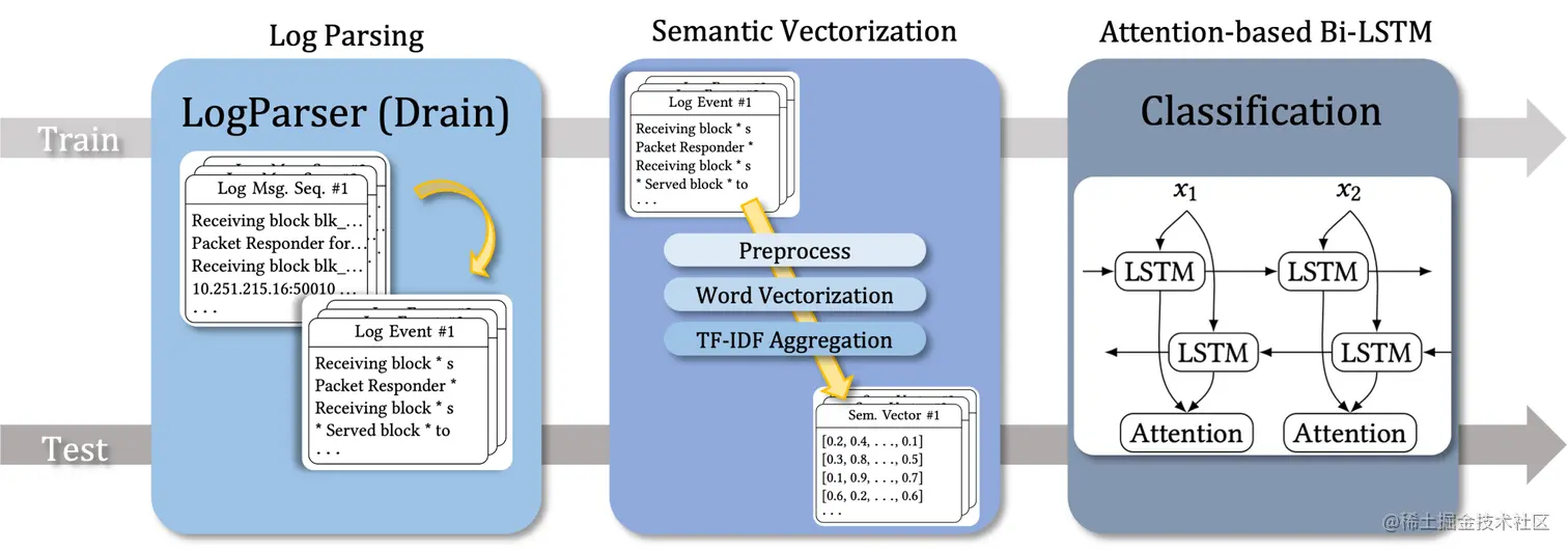 该模型基于监督学习,模型使用基于注意力的双向LSTM架构。采用Drain进行日志数据解析,特征提取器采用Word-to-Vector和TF-IDF加权技术生成日志表征。模型将正常和非正常日志数据都用于训练,最后分类器来判断日志是否是异常。