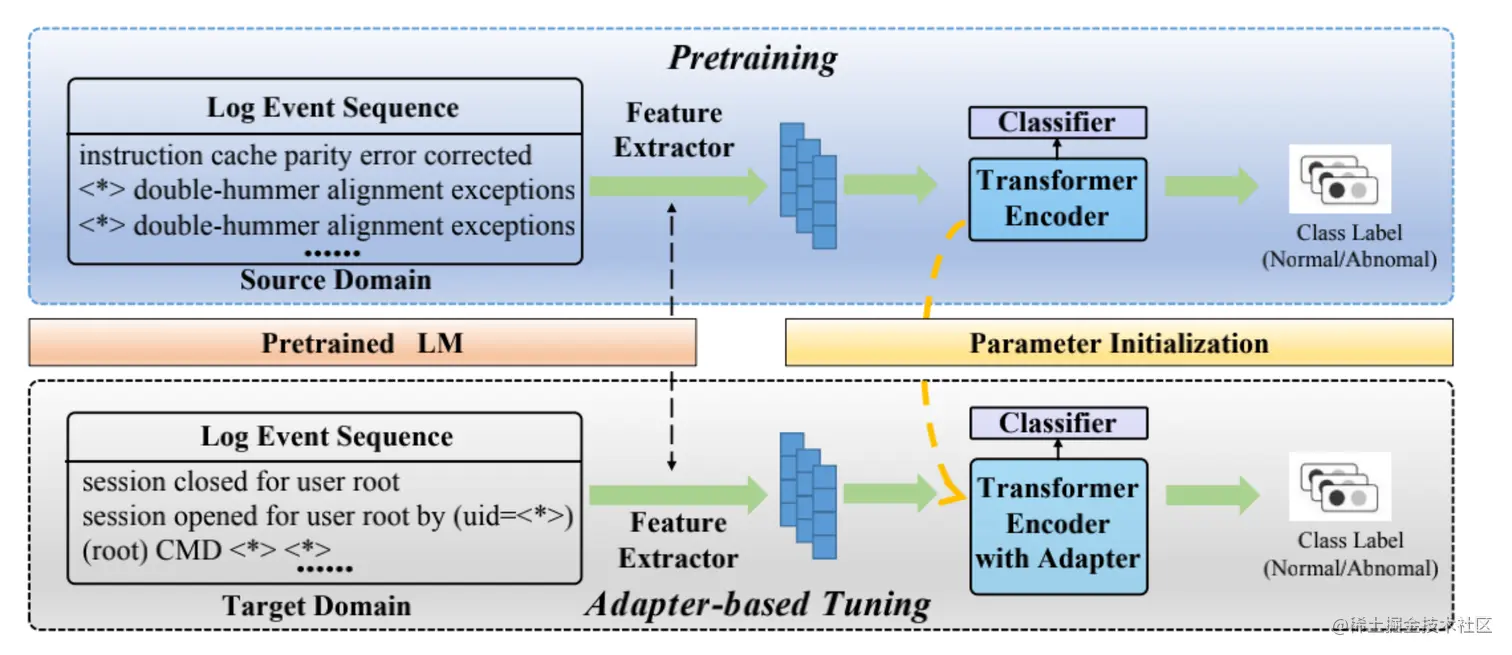 模型的框架图如下所示,主要分为两阶段:Pretrainging和Adapter-based Tuning。 首先将所有的解析好的日志事件序列输入到预先训练好的语言模型中(这里我们采用了BERT模型)以提取表示。随后采用Transformer编码器,在高资源源域数据集上进行训练,来获得共享语义信息,然后对于目标数据源,我们冻结编码器的参数,只调整目标域数据集上的Adapter的参数。这样我们就达到了将知识从源数据集转移到目标数据集上的目的。
