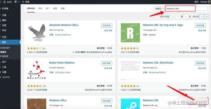 接着在界面右上角的“搜索”栏中输入“Relative URL”,键入Enter进行搜索。并在搜索结果内找到“Relative URL”,点击“现在安装”按钮。等待插件安装完成后,直接点击“启用”按钮激活插件的使用。