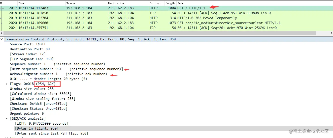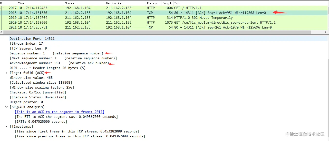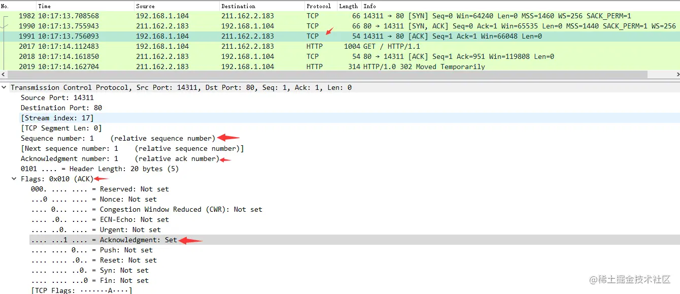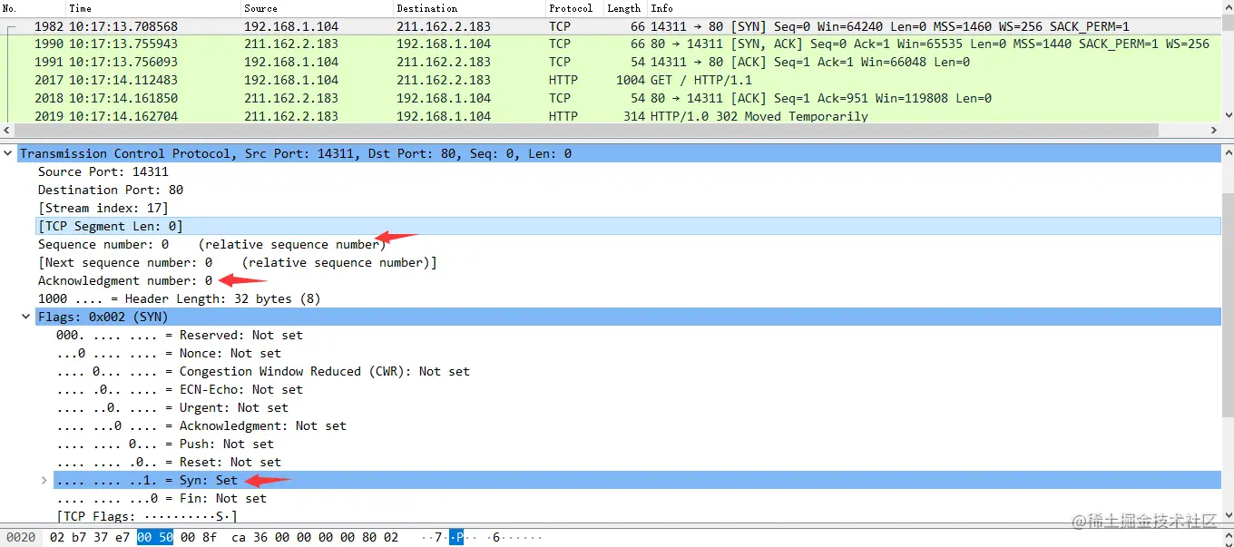 图中可以看到wireshark截获到了三次握手的三个数据包。第四个包才是HTTP的, 这说明HTTP的确是使用TCP建立连接的。