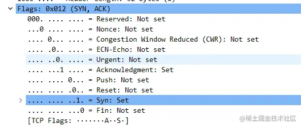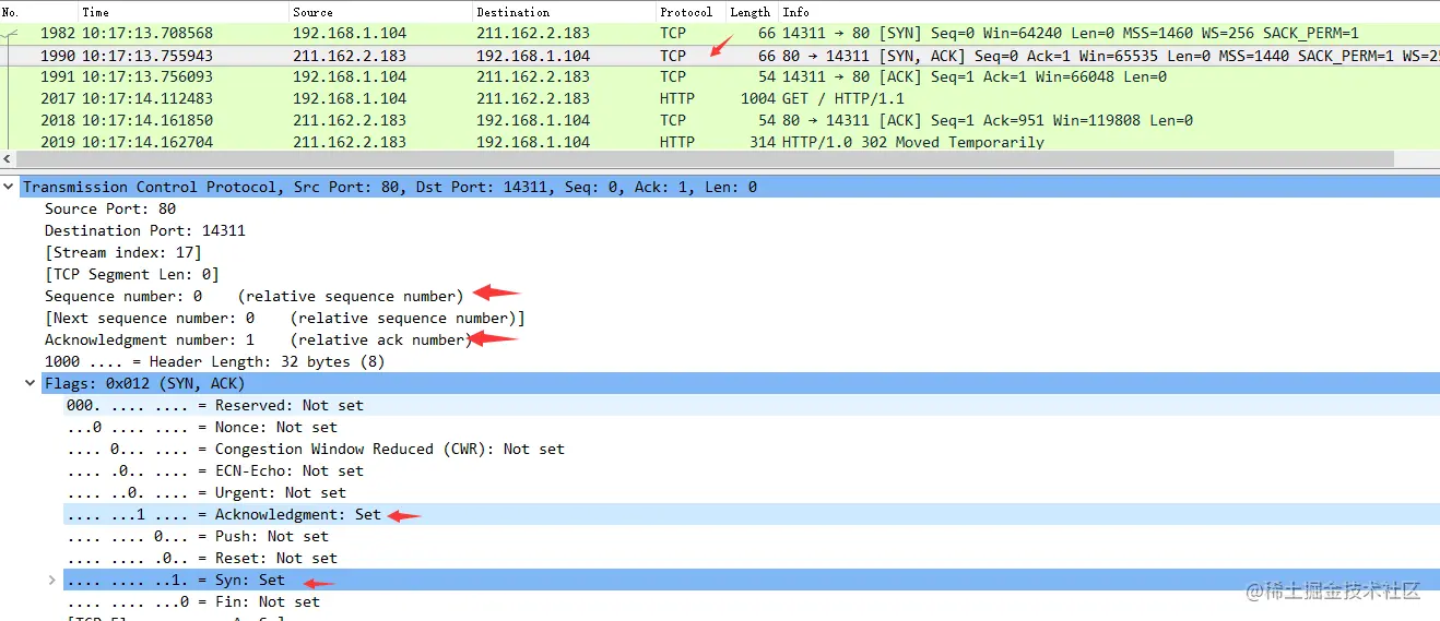 服务器发回确认包, 标志位为 SYN,ACK. 将确认序号(Acknowledgement Number)设置为客户的I S N加1以.即0+1=1, 如下图