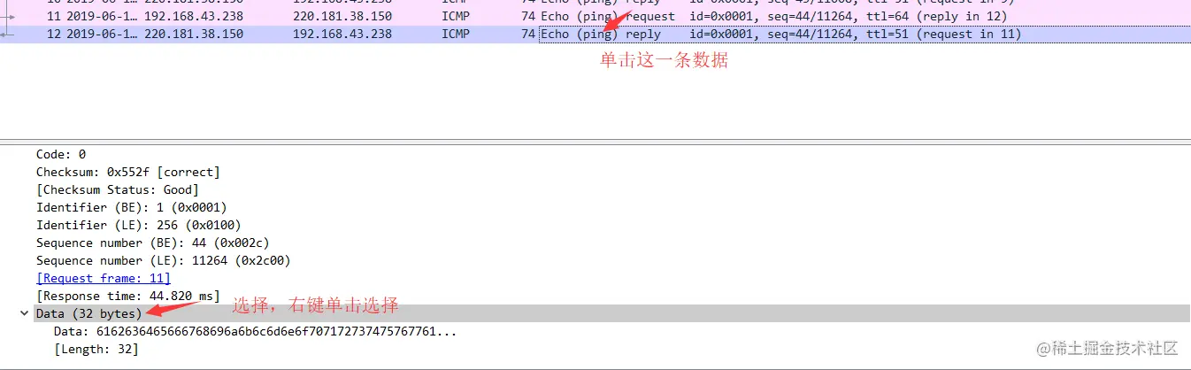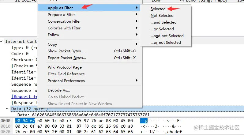 (7)按照数据包内容过滤。假设我要以IMCP层中的内容进行过滤,可以单击选中界面中的码流,在下方进行选中数据。如下