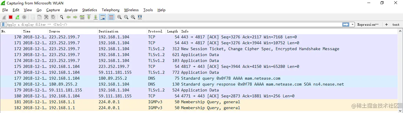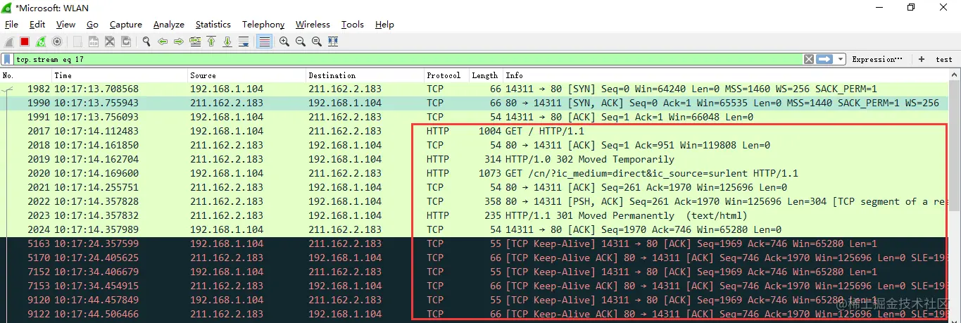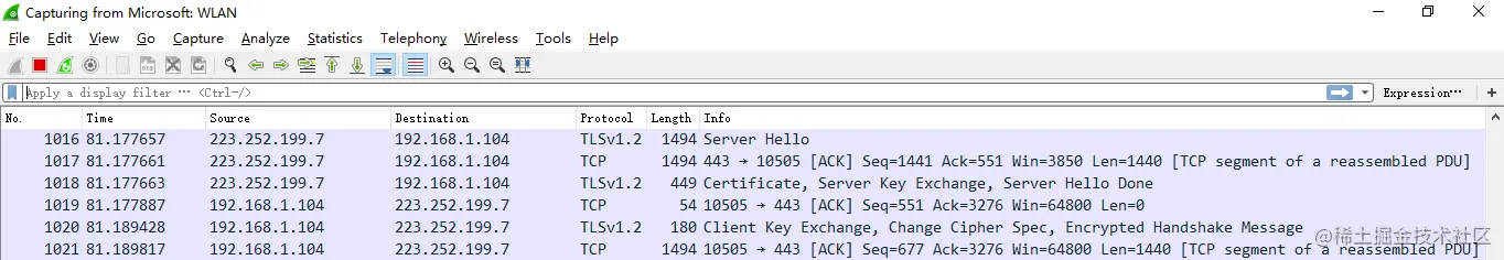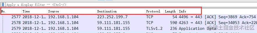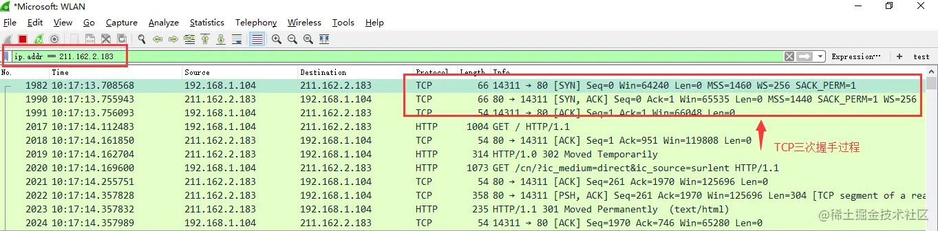 ip.addr == 192.168.1.104 显示源IP地址或目标IP地址为192.168.1.104的数据包列表