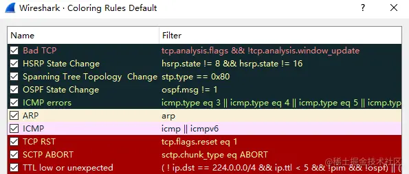 说明:数据包列表区中不同的协议使用了不同的颜色区分。协议颜色标识定位在菜单栏View --> Coloring Rules。如下所示