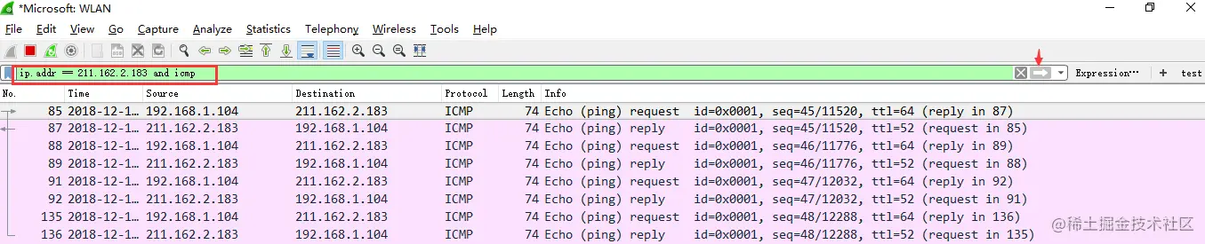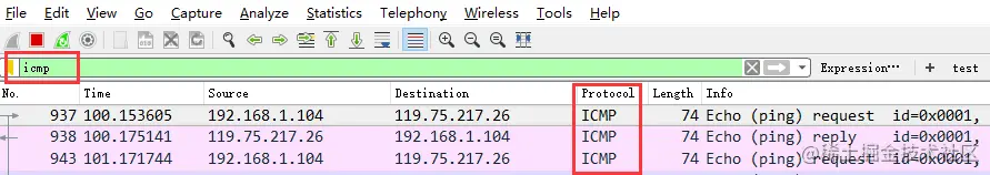 过滤多个条件组合时,使用and/or。比如获取IP地址为192.168.1.104的ICMP数据包表达式为ip.addr == 192.168.1.104 and icmp\