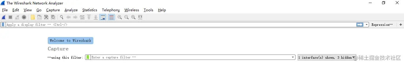 显示过滤器是用于在抓取数据包后设置过滤条件进行过滤数据包。通常是在抓取数据包时设置条件相对宽泛,抓取的数据包内容较多时使用显示过滤器设置条件顾虑以方便分析。同样上述场景,在捕获时未设置捕获规则直接通过网卡进行抓取所有数据包,如下