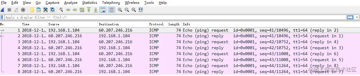 先介绍一个使用wireshark工具抓取ping命令操作的示例,让读者可以先上手操作感受一下抓包的具体过程。