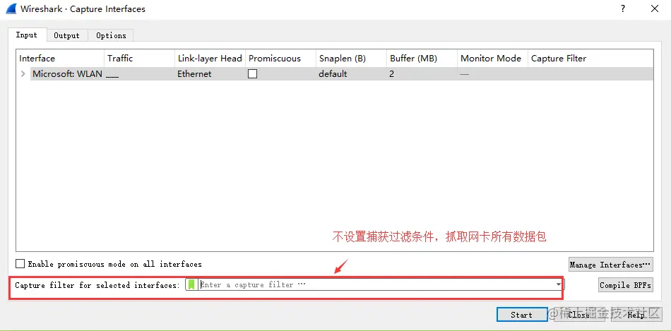 2、选择菜单栏上Capture -> Option,勾选WLAN网卡(这里需要根据各自电脑网卡使用情况选择,简单的办法可以看使用的IP对应的网卡)。点击Start。启动抓包。