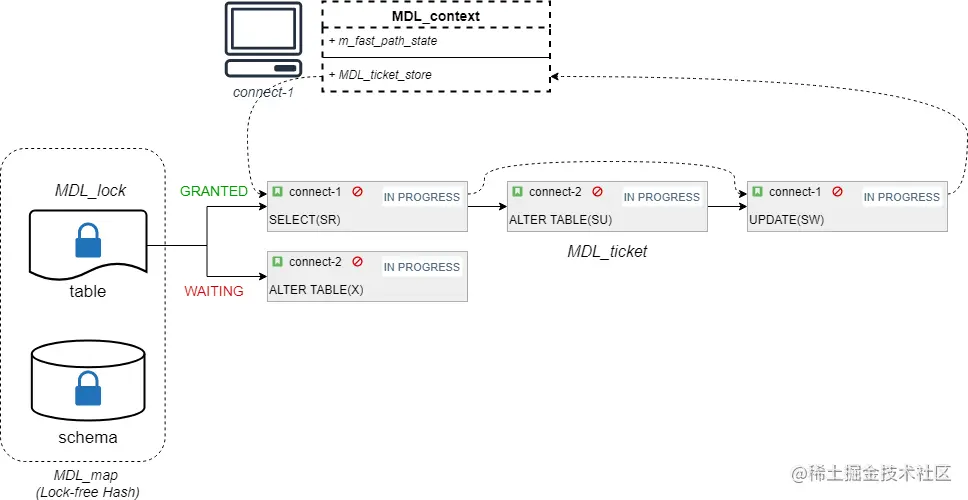 对于数据库的某一对象,仅有一个与其名字(MDL_key)对应的锁对象 MDL_lock 存在。当数据库的对象在初次被访问时,由 lock-free HASH 在其内存中创建和管理 MDL_lock;当后续访问到来时,对于相同对象的访问会引用到同一个 MDL_lock。