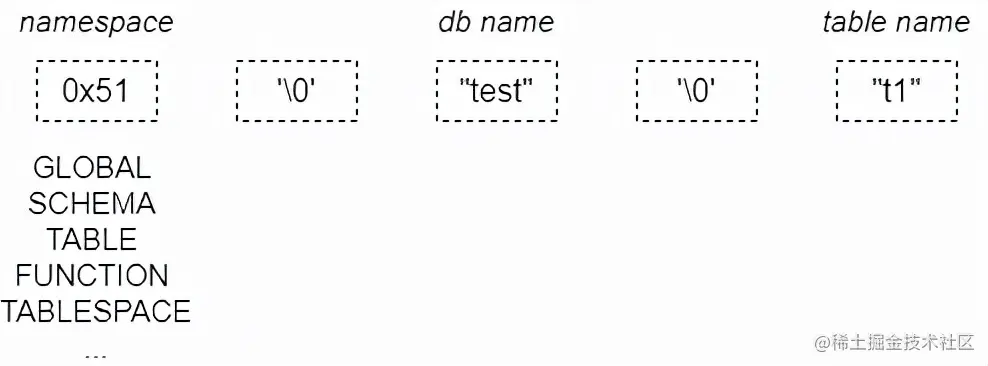 对象的名称根据类型的不同可以由多种层次组成。比如表对象就由数据库名和表名唯一的描述;如果是 SCHEMA 对象,那就只有数据库名这一个层次。名称之间用字符串结束符 '\0' 分隔。因此由这几部分组成的字符串整体就能作为 key 唯一的表示数据库的某种对象。