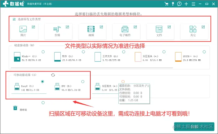 主要步骤:打开软件后(www.shujuwa.net/shujuhuifu/ ),我们就可以开始进入操作了,选择所有的文件类型,何况u盘格式化的话我们不确定有多少种文件类型在u盘中,所以建议全部选择;文件位置是可移动设备,但是你需要将u盘成功在电脑上读取成功才能浮现出来进行选择。当我们选择好这两个部分后,马上点击“扫描”;