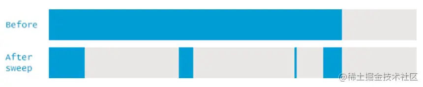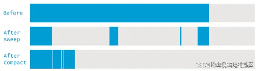 这个算法执行分两阶段,第一阶段从引用根节点开始标记所有被引用的对象,第二阶段遍历整个堆,把未标记的对象清除。此算法需要暂停整个应用,同时,会产生内存碎片。例如: