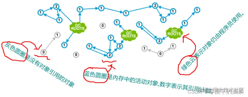 这个算法是给每一个对象设置一个引用计数器,每当有一个地方引用这个对象的时候,计数器就加 1,与之相反,每当引用失效的时候就减 1。也就是以计数来判断对象是否为垃圾。例如: