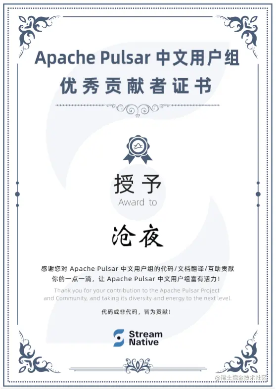 - 获得 StreamNative 颁发的志愿者/互助组成员荣誉证书;