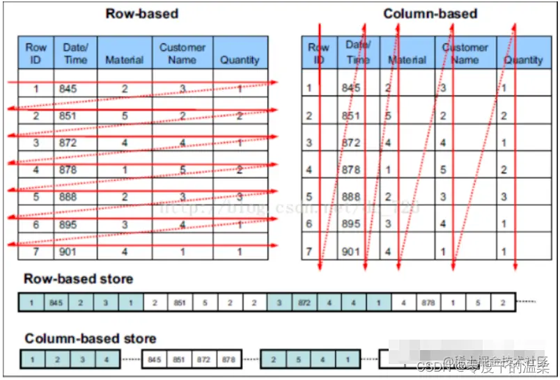 行存储的特点: 查询满足条件的一整行数据时,列式存储则需要去每个聚集的字段找到对应的每列的值,行存储只需要找到其中一个值,其余的值都在相邻地方,所以此时行存储查询数据更快。