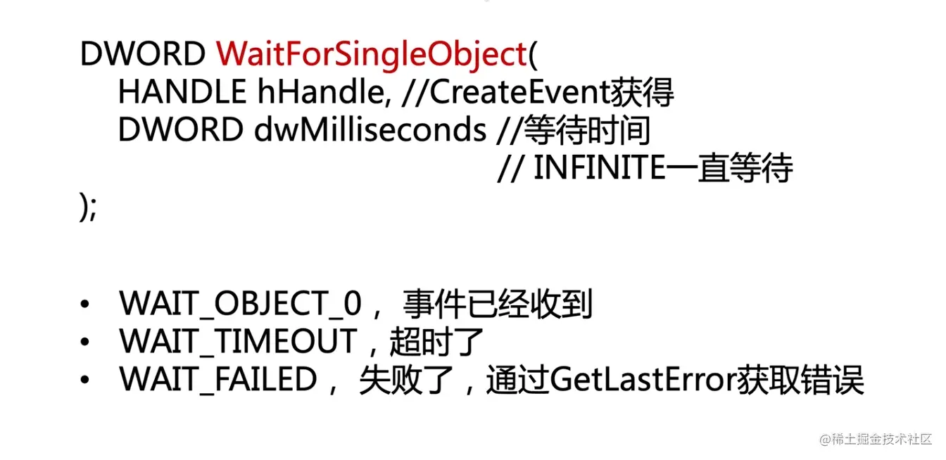 WAIT_FAILED : 失败, 通过GetLastError获取错误信息.