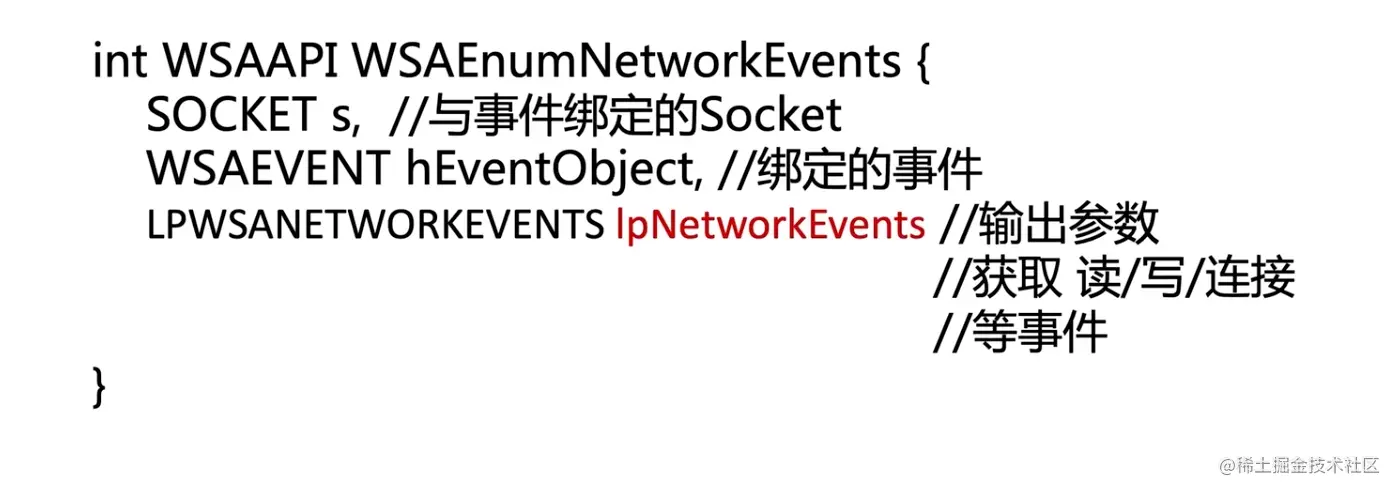 WSAEnumNetworkEvents : 枚举发生事件的socket, 用于判断是哪个socket触发的该事件.