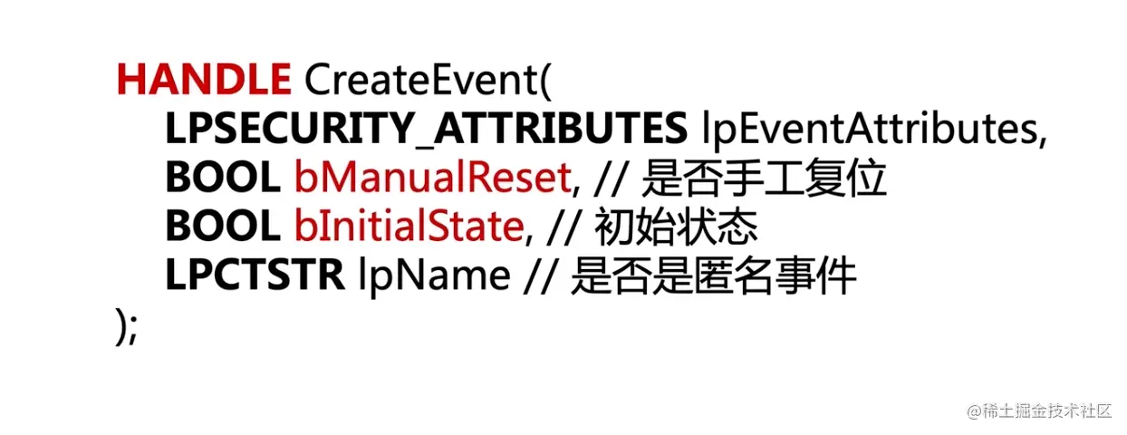 参数三: 初始状态,true表示事件正在触发中, 一般设置false, 这样才能使用setEvent触发事件, 唤醒等待线程.