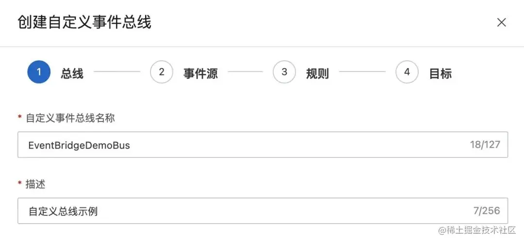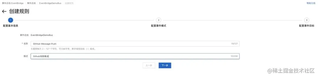 在 EventBridge 控制台页面点击进入刚刚创建的 EventBus 详情页,在左侧一栏中“事件规则”选择“创建规则”。