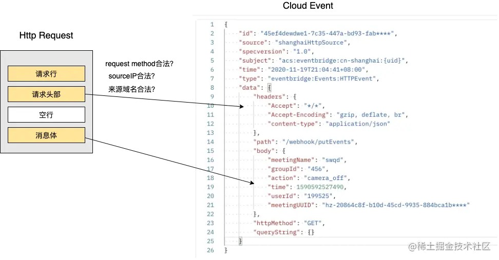 在将 HTTP 请求转换为 CloudEvent 的时候,EventBridge 会将请求的头部和消息体部分置于 CloudEvent 字段中,其余字段会依据用户 EventBridge 资源属性以及系统默认规则进行填充。用户可以在事件规则中,对所需的内容进行过滤、提取,最终按照模板拼装成所需的消息内容投递给事件目标。