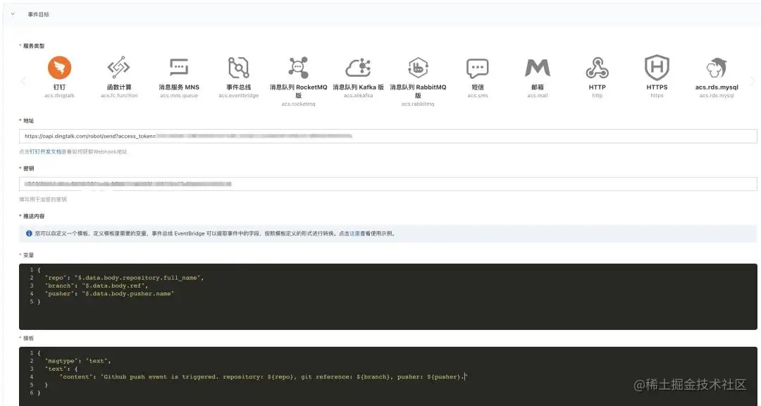 创建时间目标。选择钉钉,并将钉钉机器人的 Webhook 地址和密钥填入,推送内容侧可以按照需求设计。