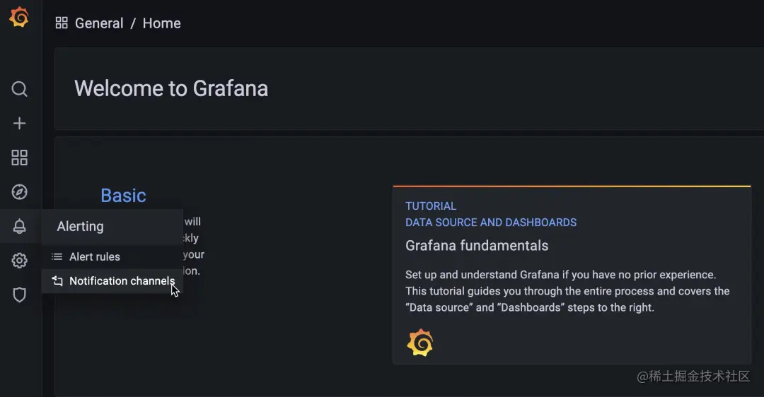点击 Grafana 控制台左侧“Alerting-Notification channels”,选择“Add channel”。