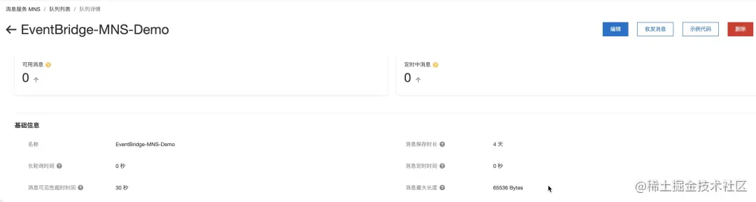 登陆 MNS 控制台,进入队列详情页,点击页面右上角“收发消息”,可以看到 MNS 已经接收到刚刚 Grafana 发送的消息。