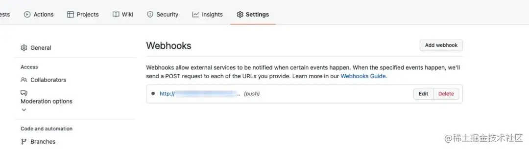 3)在 GitHub 代码仓库创建 Webhook