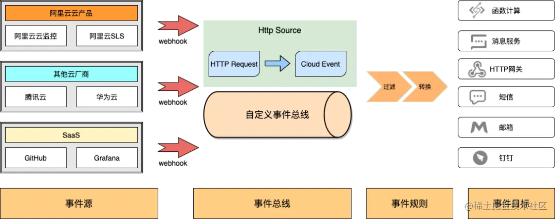 - 而对于其他云厂商、SaaS 产品,EventBridge 同样也提供便捷的接入方式便于用户进行集成,HTTP Source 事件源便是一种典型的接入方式。
