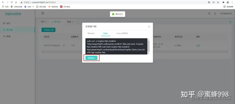 2.点击 【安装客户端】按钮 找到Linux客户端. 直接点击 【复制命令】