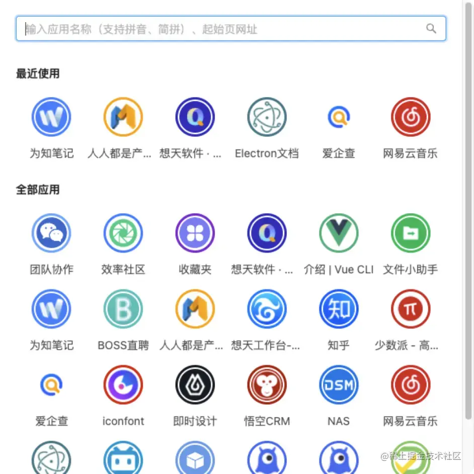点击应用管理图标,展开快速启动应用的面板。这里的设计参考了微信小程序。