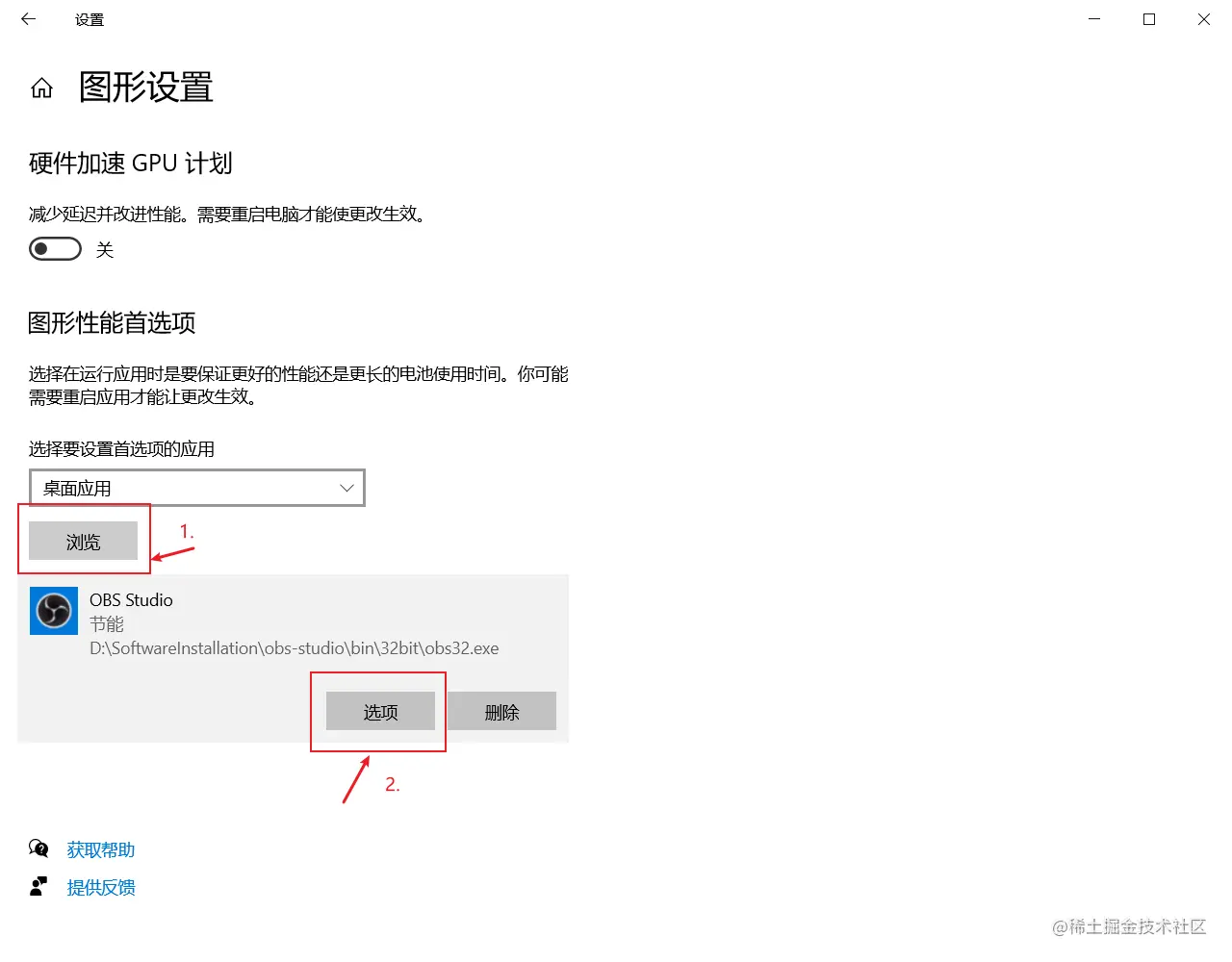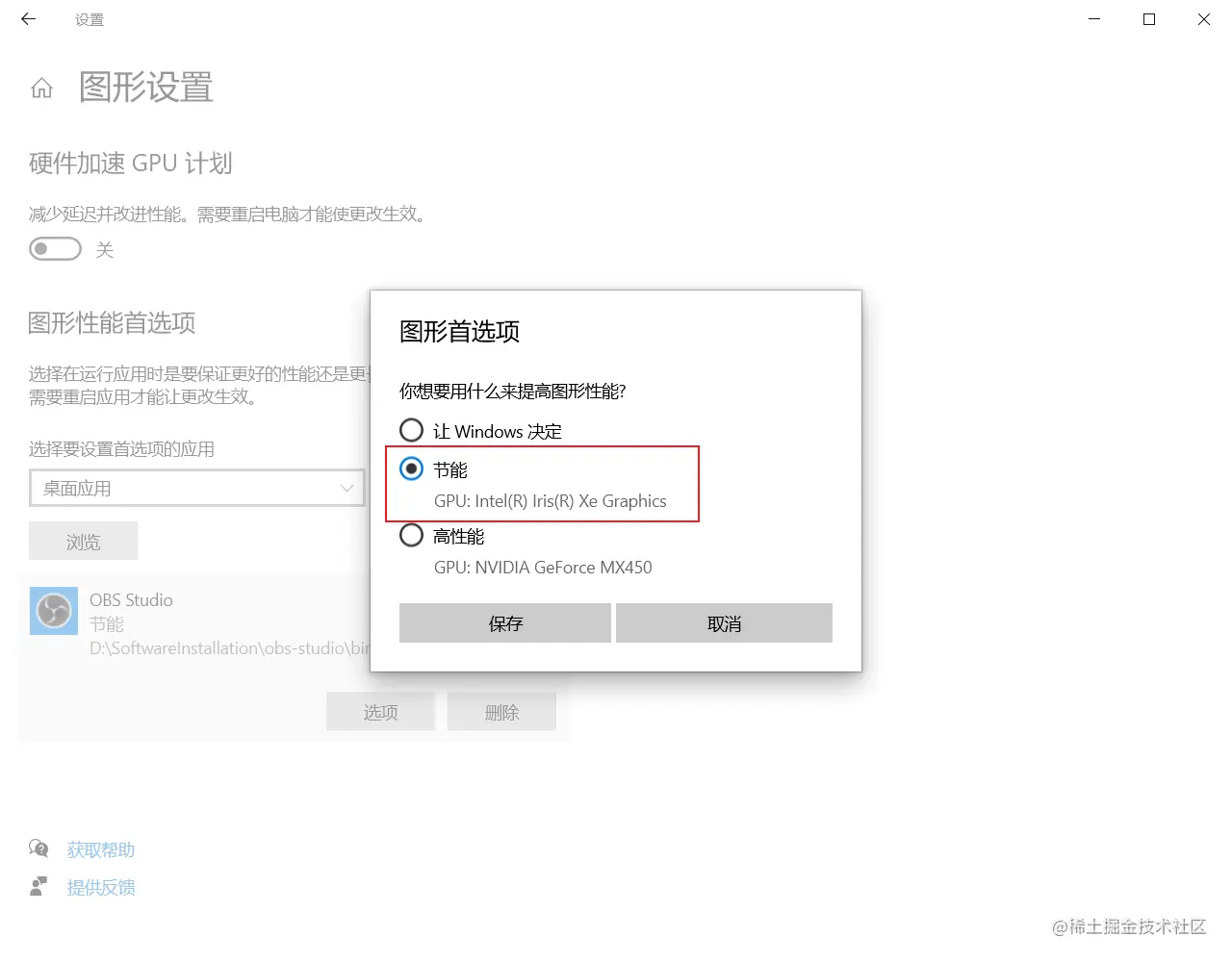 obs黑屏问题解决 LSnow_Y 2022-03-18 104 阅读1分钟 电脑配置:独立显卡 问题:黑屏 解决: windows窗口图标找到【设置】,通常在关机键上方 【系统】-> 【显示】 -> 【图形设置】 -> 【浏览】,选中obs.exe 之后保存即可。 【节能】=【集成图形】 【高性能】 = 【高性能NVDIA处理器】