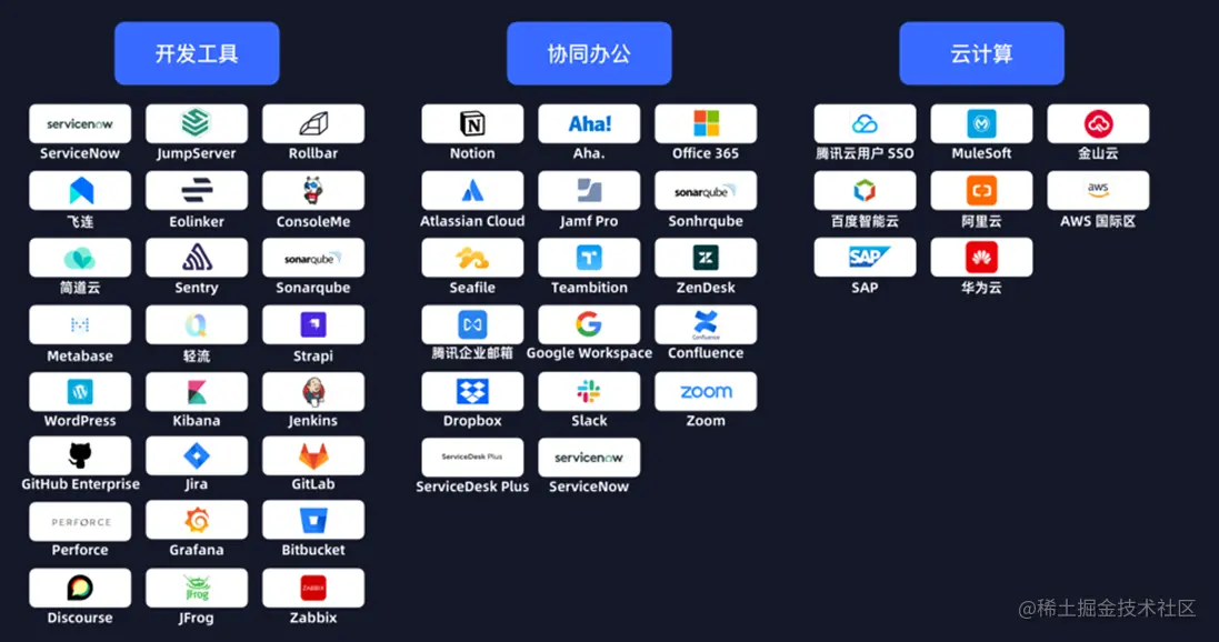 一经推出,就有 Google Workspace、Github、GitLab、腾讯云、阿里云、华为云、AWS、飞书、 ZOOM、Jenkins、JFrog、Salesforce、Zabbix 等数百家应用接入。