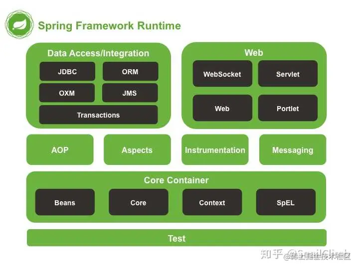我们一般说 Spring 框架指的都是 Spring Framework,它是很多模块的集合,这些模块是:核心容器、数据访问/集成,、Web、AOP(面向切面编程)、工具、消息和测试模块,如下图所示。Spring 的框架的主要目的就是简化 Java 后端开发工作。