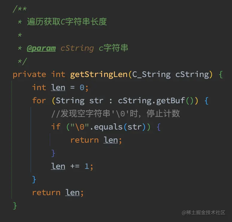 我们这里用Java的for循环(只是用Java举例,实际是C语言实现的)简单说明下C语言如何获取字符串长度。